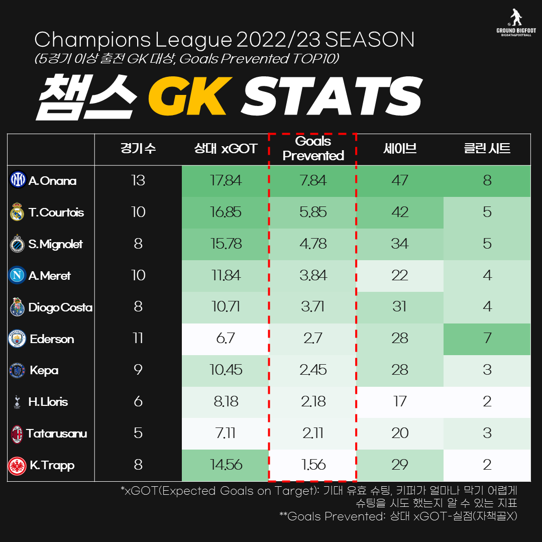 GK์ ์ ๋ฐฉ ๋ฅ๋ ฅ์ ํ๊ฐํ ๋ ์ธ์ด๋ธ, ํด๋ฆฐ ์ํธ ๋ฑ์ ๋ง์ด ์ฐธ๊ณ ํ๊ณค ํฉ๋๋ค. ํ์ง๋ง Goals Prevented ์งํ๋ฅผ ์ดํดํ๋ค๋ฉด ์ผ๋ง๋ ํคํผ๊ฐ ํ ์ค์ ์ ์ค์ฌ์คฌ๋์ง๋ฅผ ๋ ์ง๊ด์ ์ผ๋ก ์ ์ ์์ต๋๋ค.